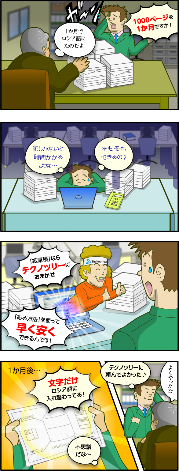 テクノツリーは、原文の入力作業を省く独自の方法により、納期とコストを削減いたします。