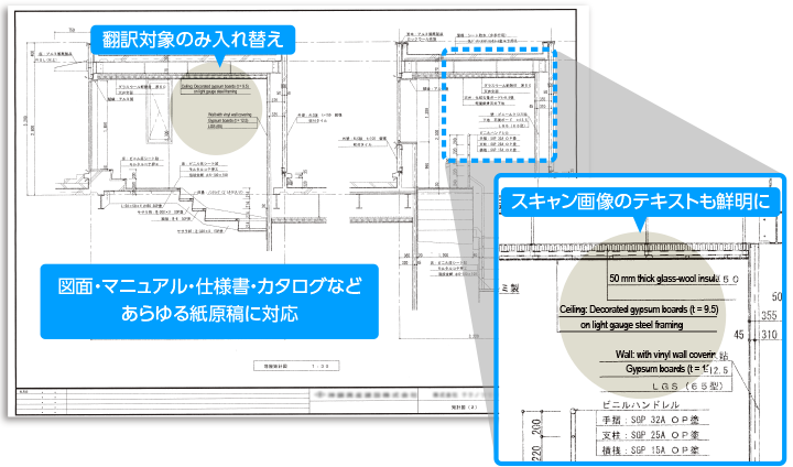 また、紙のレイアウトそのままの形で翻訳を流しこむことが可能です。