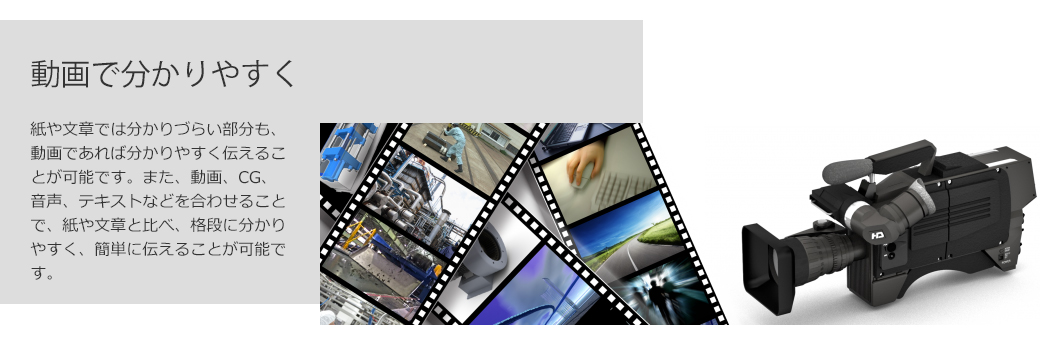 技術説明や、熟練者が持っている作業や操作などのノウハウなども、映像であれば、非常に分かりやすく伝えることが可能です。たとえば、紙を使った説明では、内容を詳細に記載しても、文章では伝わりづらいですが、映像であれば、作業工程や操作などの細かいノウハウも、簡単に分かりやすく伝えることが可能です。