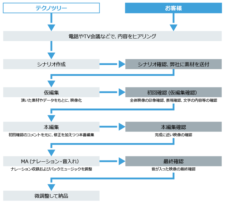 テクノツリーは、映像制作に関して、企画・脚本から撮影、編集、ナレーション、オーサリングまでワンストップでで制作が可能です。安心してお任せください。